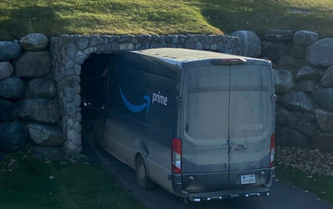 Грузовик службы доставки Amazon по указаниям навигатора оказался на поле для гольфа и не смог проехать игровой тоннель. Так Ford Transit застрял в тоннеле. И ведь водителя не смутило, что он едет по дороге для гольф-каров и вообще находится не на автодороге.