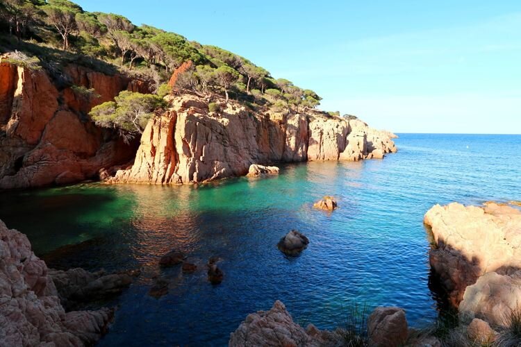 Здесь прямо в бирюзовое море обрываются высокие рыжие скалы, густо поросшие соснами пиниями, а между участками неприступных скал скрываются укромные бухты с мягким песочком.