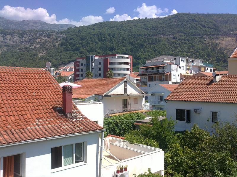 Перемещаться самостоятельно из аэропорта к отелю я всё ещё не умела, так что мы воспользовались трансфером из Тивата в Будву. Заселились в уютную, обжитую виллу “Petrova” в восьми минутах ходьбы от моря. Внутри было чисто и комфортно. С террасы в нашем номере открывался вид на горы, город и черепичные крыши домов, усеянные котами, греющимися на солнце.
