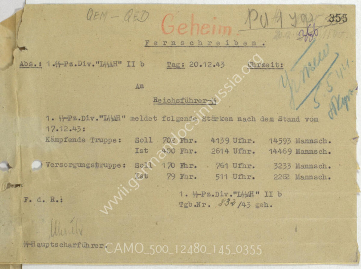 Листая фотокопии трофейных немецких документов о боях конца 1943-го, я наткнулся на отчет 1-й дивизии СС Лейбштандарт о ее численности, как штатной, так и фактической. Причем численность эта приведена на 20-е декабря 1943-го года, когда дивизия уже больше месяца участвовала в боях под Киевом и несла потери. Действовать в районе Киева Лейбштандарт начал отдельными частями еще с 9-го ноября 1943-го.