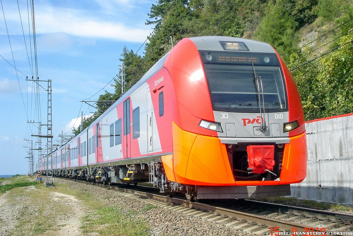 1. Долгое время железная дорога, что в один путь идет по берегу Черного моря, была собранием старого подвижного состава. Например, еще в начале XXI века запросто можно было встретить электропоезд ЭР2, который сейчас в Подмосковье и Москве работает как ретропоезд. Но в 2014 годы в Сочи пришла Олимпиада. И транспорт стали менять на новый. Так, на Кавказе появились электропоезда "Ласточки". И вот мимо нашего сегодняшнего автора (а это вновь loc27799) сначала прошел со стороны Вардане в Лоо электропоезд ЭС1-010.