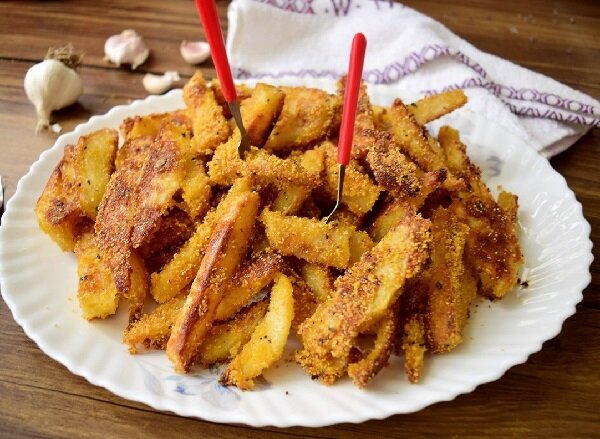 Запеченную в панировке картошку можно подавать с овощным салатом, томатным соусом, или же в качестве гарнира к отварной рыбе.