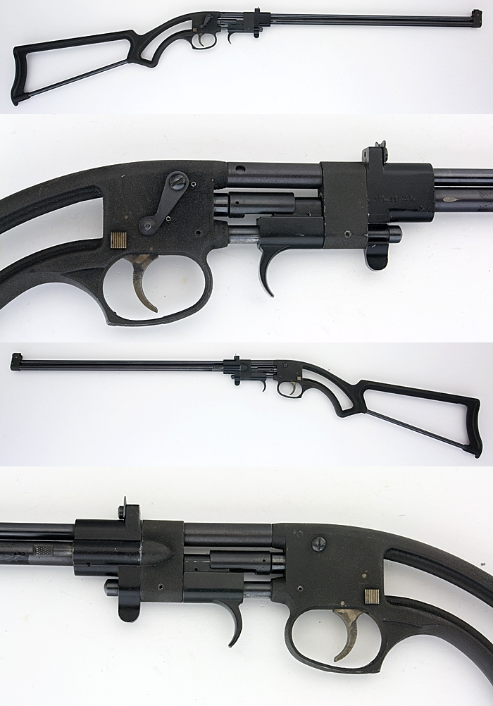 Вспомнили же об этой конструкции, когда в конце 1960-х на американском рынке становились все популярнее удачно разрекламированные маркетологами различных фирм предельно простые "винтовки выживания", собиравшиеся по рецепту "легко разбирать, минимум деталей, .22LR или .410, а лучше и то, и другое". Отсюда и характерные черты конструкции: скелетный приклад, отлитый из цинкового сплава, открытый ударниковый УСМ, где ударник взводился передним крючком (одновременно отодвигавшим назад и нижний сопорный палец), а перезарядка осуществлялась поворотом ствола на верхней оси, которая его же и удерживала в колодке, пока не будет провернут вверх боковой флажок. Ну, разве что движковый предохранитель, блокировавший спусковой крючок, пришлось добавить для следования букве закона - и больше в этой винтовке ничего и не было.