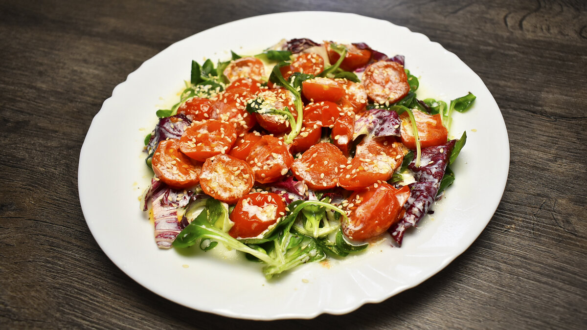 Привет, мир! Сегодня хочу поделиться с Вами рецептом салата как в ресторане. Почему как в ресторане? Потому что, подобный салат я именно там и попробовала. Он мне очень понравился своим вкусом и я решила его повторить. Помидорки для такого салатика лучше всего использовать черри. Томаты обжаривать нужно не сильно долго, так чтобы они не развалились на сковороде. Я готовлю салатик для нас с мужем.