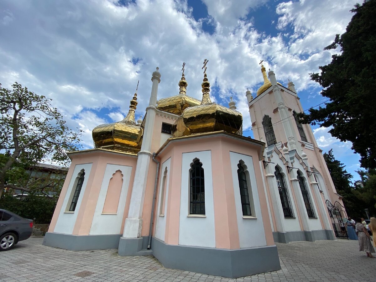 На холме среди небольших малоэтажный зданий возвышается Храм #святого иоанна златоуста Это первый соборный храм в Ялте, построенный в 1837 году по инициативе графа Воронцова. На освещении собора был император Николай I.