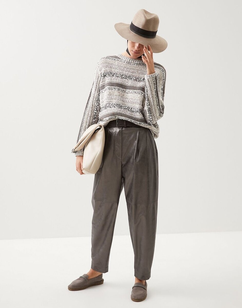 Использование пайеток - актуальный приём декора изделий ручного вязания. Благодаря сдержанной цветовой гамме, выдержанной в серо-бежевых тонах, образ выглядит в меру сдержанно, но в то же время эффектно и стильно.