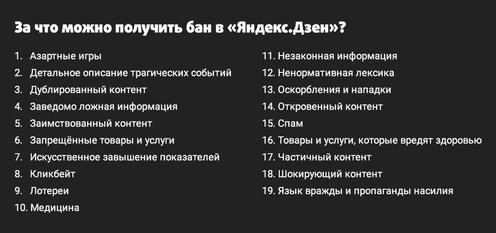 После проверки мне пришёл ответ, что на канале размещена информация, которая подходит под определение "заимствованного контента". Мои статьи перестали появляться в ленте и только уже имеющиеся подписчики могли их видеть. Причём никто не указывает, что конкретно не так, автор канала должен сам во всём разобраться и удалить лишнее. В первый раз блокировку сделали на 1 месяц.