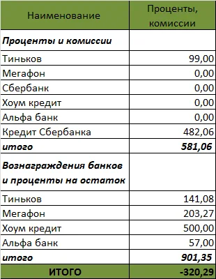 Ну главное достижение этого месяца - это то, что мой кредит вышел для меня беспроцентным! Да, вот так бывает. Все карточки - в грейсе, проценты только по кредиту Сбербанка (а там долг всего 40 тысяч). Зато кэшбэк и проценты на остаток вышли аж на 900 рублей. Вот смотрите таблицу сами: