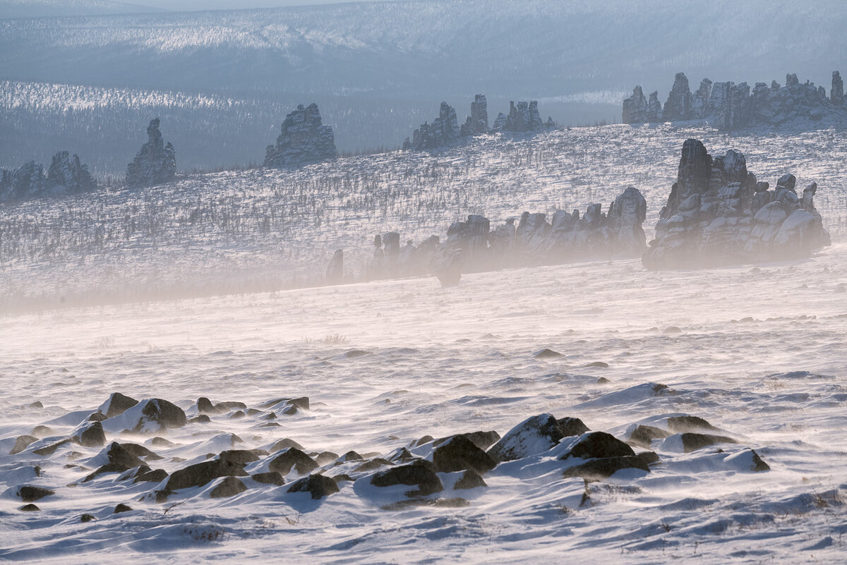 Фотоэкспедиция - Гранитные города Улахан-Сис 2021 успешно завершена. Все участники разъехались по домам. И в этот раз тоже не обошлось без приключений. В Белую Гору мы прилетели 4 марта. Если бы рейс был днём позже, то мы бы крепко застряли в Якутске из-за нелётной погоды. Но мы всё равно застряли, но уже в Белой Горе. Началась пурга и три дня мы не могли никуда стронуться. К тому времени, как погода улучшилась, дорогу, конечно, замело напрочь. По плану мы должны были 5 марта выехать на двух автомобилях по зимнику и проехать 230 километров, а потом всего лишь 15 километров на снегоходах. Но так теперь не получалось. Попытка пробиться на Камазе также не увенчалась успехом. Оставался единственный выход, садиться на снегоходы и ехать прямо от посёлка 200 километров. Вот мы и выехали ровно 8 марта, что было неожиданным подарком для наших двух девочек. Но деваться было некуда. У нас было три Бурана и всего два местных водителя, поэтому мне пришлось тоже рулить. Ехали целый день с утра до ночи. Пока ехали по заметённому зимнику, ещё было всё сносно, хотя мешали лежачие полицейские в виде снежных перемётов и прочие снежные препятствия. Но когда свернули с дороги и вошли в лес, стало совсем не весело. Хорошо ещё, что с базы навстречу выехал ещё один снегоход и пробил дорогу. Но всё равно снегоходы периодически зарывались в сугробы и их приходилось вытаскивать. К тому моменту наступила тёмная ночь. А потом испустил дух один из Буранов. Хорошо ещё поблизости оказалась охотничья избушка, где оставили часть группы. До базы от избушки оставалось всего лишь 15 километров и когда добивали эту часть, небо полыхнуло авророй.