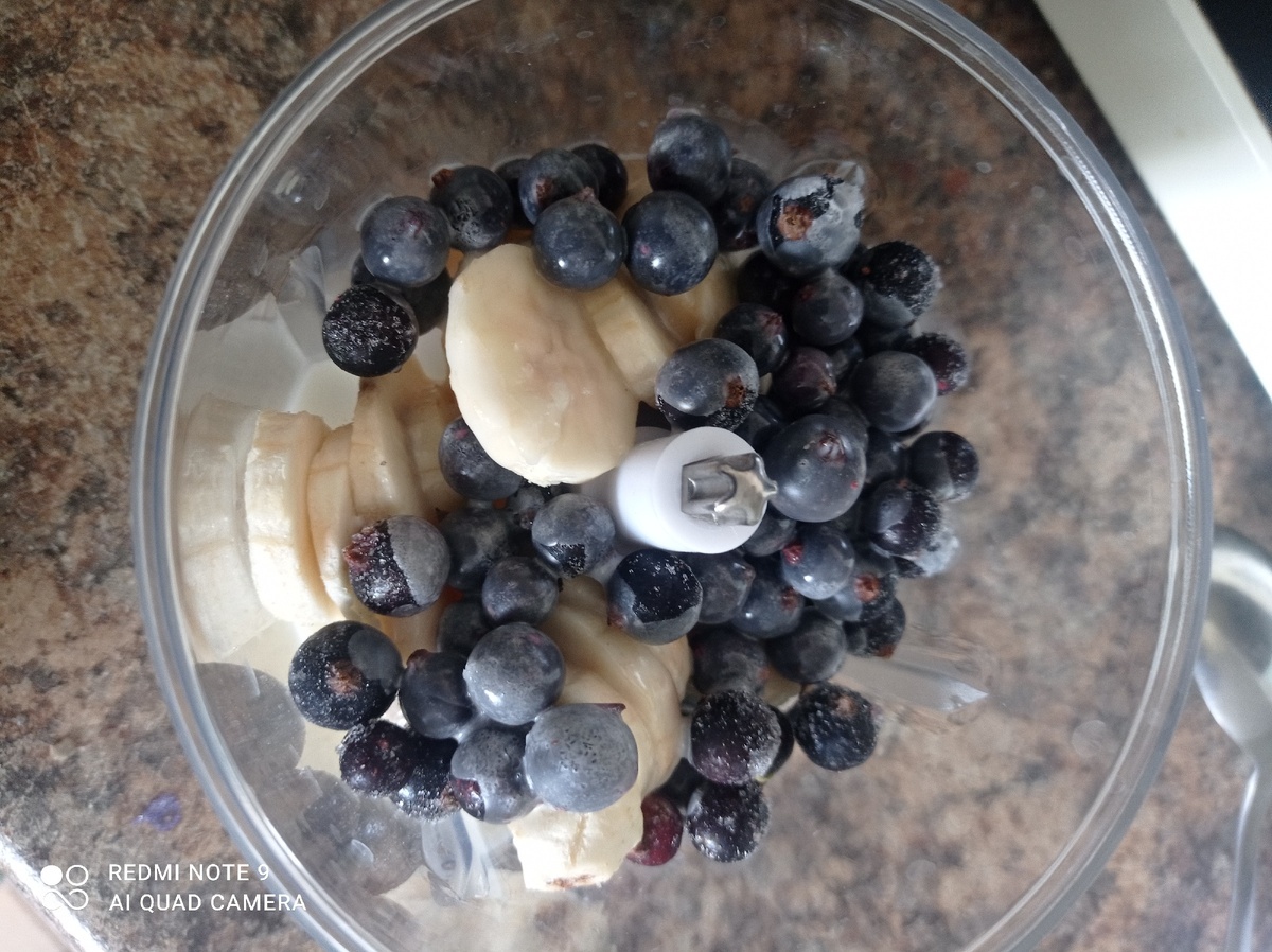 В измельчитель закладываем замороженый банан, горсть замороженой черной смородины, столовую ложку без горки сахара (на диете можно пропустить) и наливаем грамм 100-150 молока.