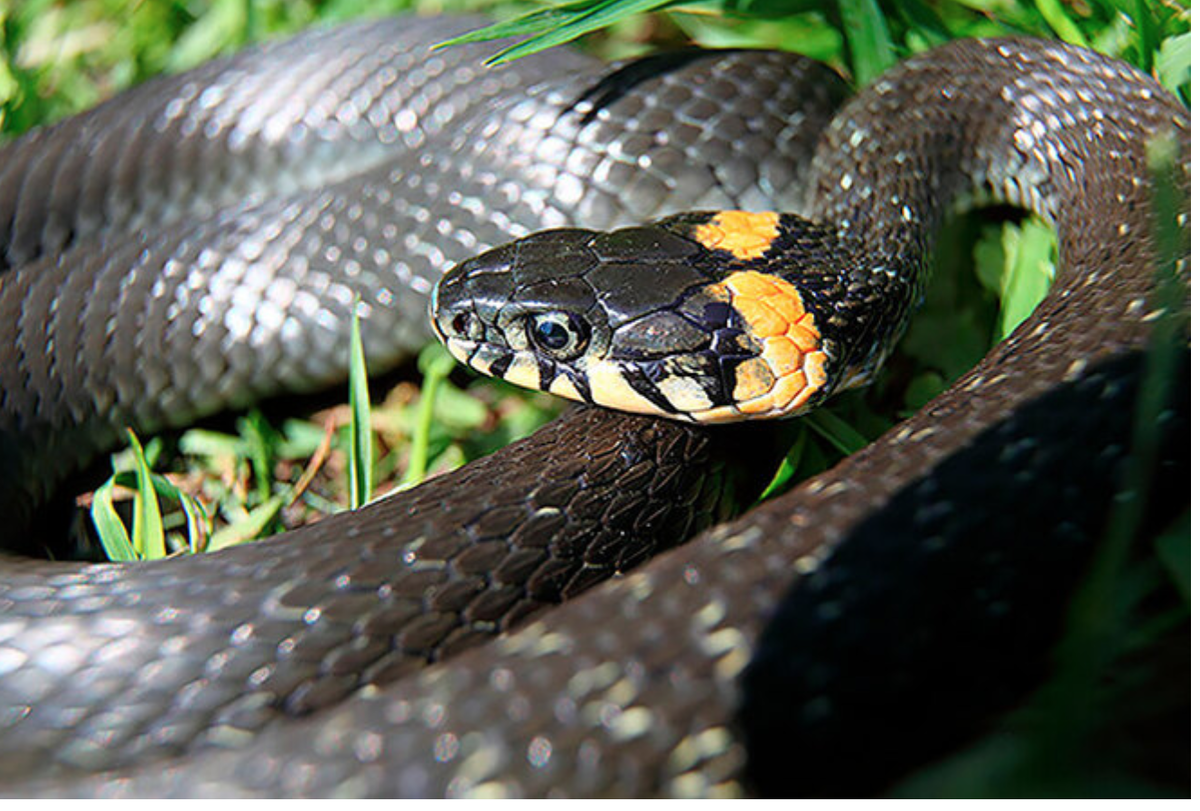 У гадюки таких ярко-выраженных пятен на голове нет, ее окрас более блеклый и равномерный. Либо с зигзагообразным рисунком вдоль всего хребта, либо – реже – черный, темно-серый. Чешуя у гадюки более матовая и тусклая.