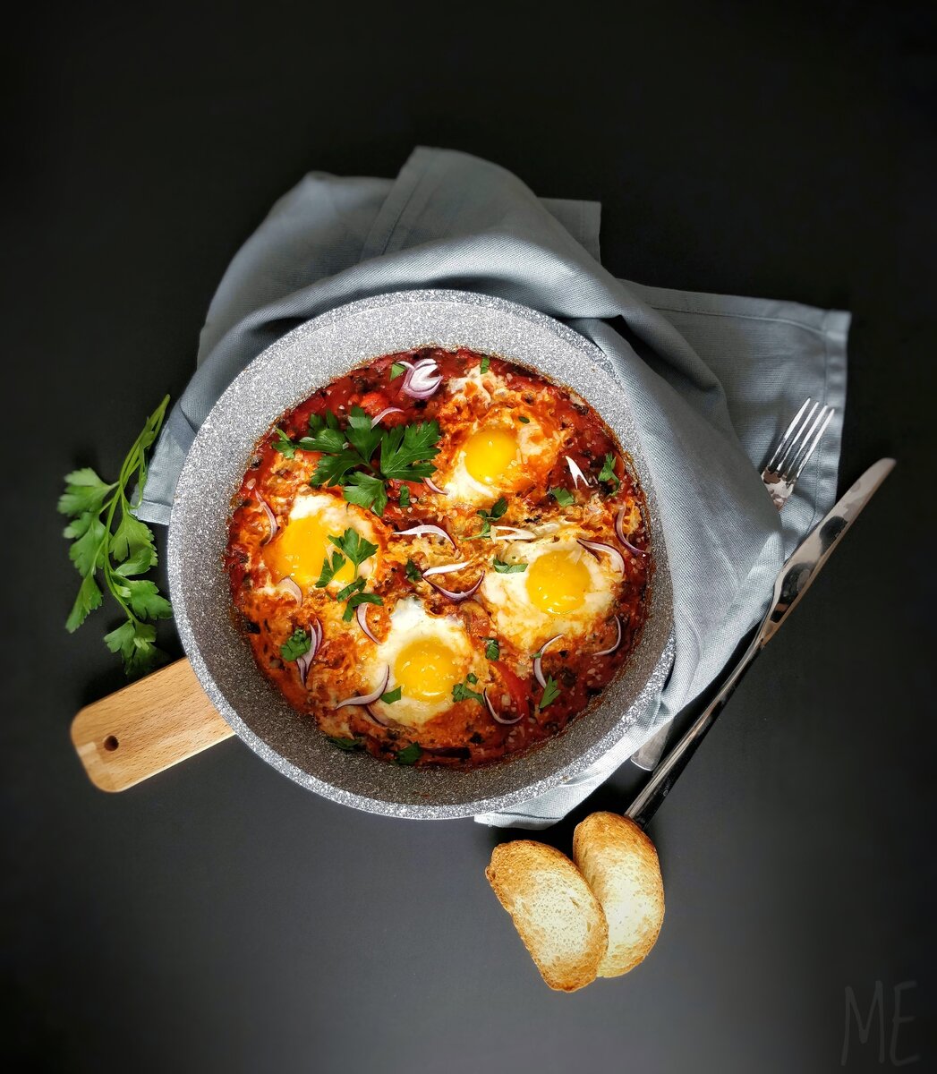 Шакшука - это своего рода яичница, которая готовится в томатном соусе с острым перцем, луком и подаётся с хлебом. Является национальным завтраком Израиля.