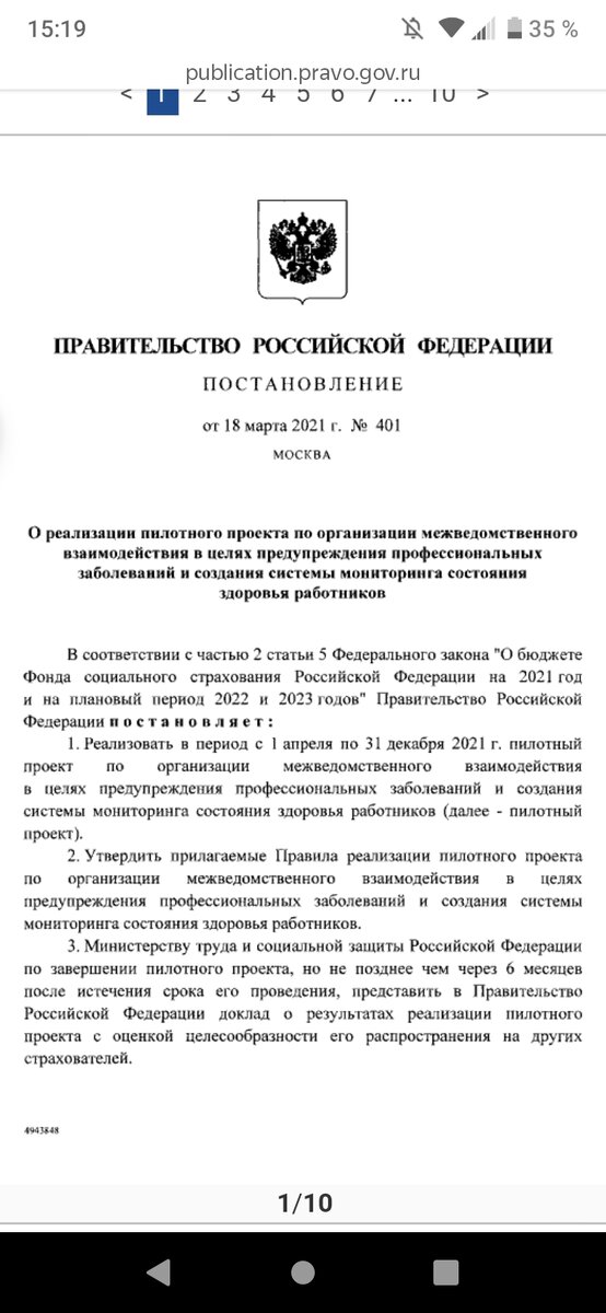 Буквально вчера на портале правовой информации появился весьма примечательный документ, а именно Постановление Правительства Российской Федерации " О реализации пилотного проекта по организации межведомственного взаимодействия в целях предупреждения профзаболеваний и создании системы мониторинга состояния здоровья работников