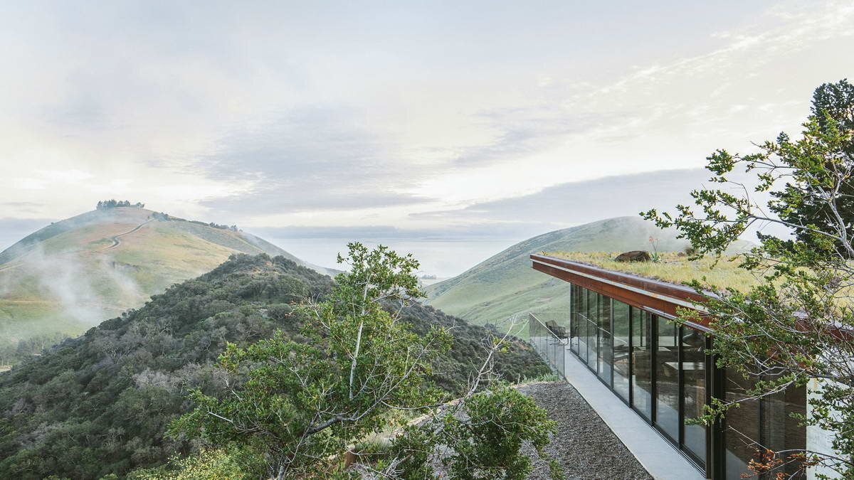 Резиденция, расположенная на крутом склоне холма, была спроектирована с низким визуальным и экологическим воздействием на окружающий ландшафт. Замаскированный низким профилем и зеленой крышей, сам дом предлагает широкие (почти 360 градусов) виды на Тихий океан и окружающие холмы, через щедрое количество скользящих стекол и обширных палуб.