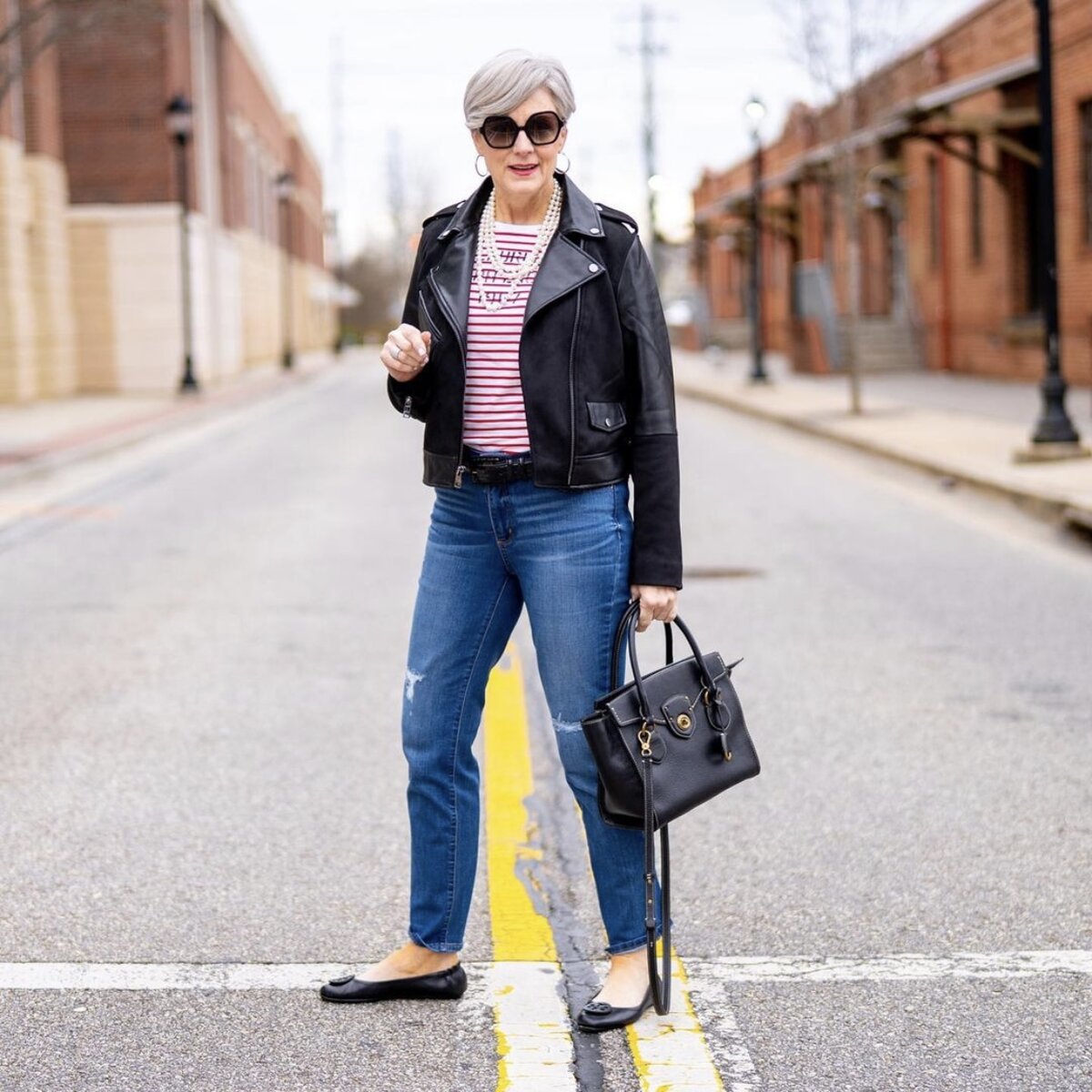 Изящные кожаные балетки в сочетании с прямыми джинсами и косухой актуальны отнюдь не только, когда вам 20. Добавьте к