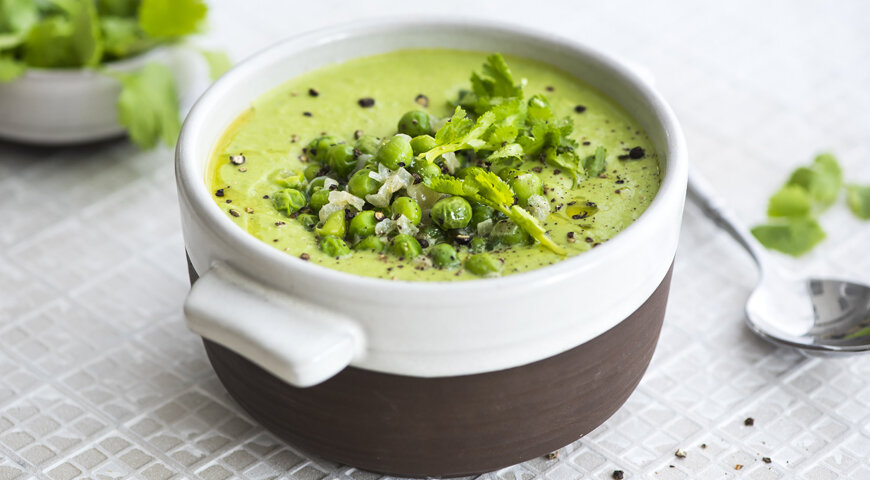 Всыпьте замороженный горошек, перемешайте, залейте 700 мл холодной воды. Доведите до кипения, варите 5 мин. Добавьте рубленую кинзу (отложите немного для подачи), взбейте блендером до однородности.