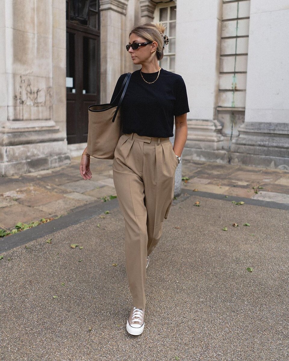 Стилисты успешно используют свободный фасон в моделировании фигуры. В зависимости от образа, края футболки оверсайз могут быть заправлены под пояс полностью или частично.