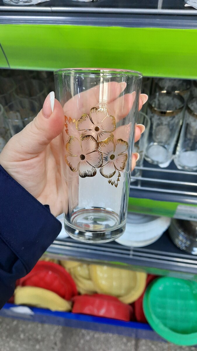 Стакан изготовлен из стекла и идёт с красивым дизайном в виде цветов.