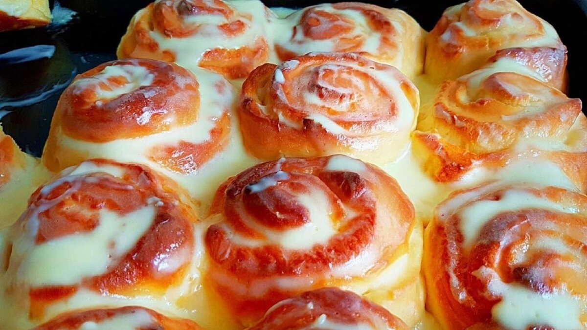 15. Сразу же после выпечки обильно смажьте завитушки сметанной заливкой, плотно накройте и оставьте до полного остывания (или хотя бы до теплого).