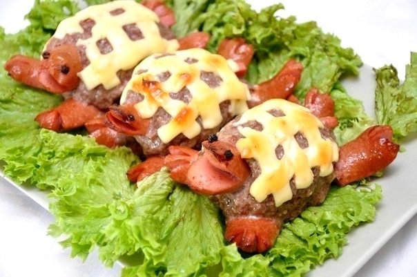Пластинки сыра нарезаем полосками и в виде сеточки выкладываем на котлету – «спинку» черепашек.