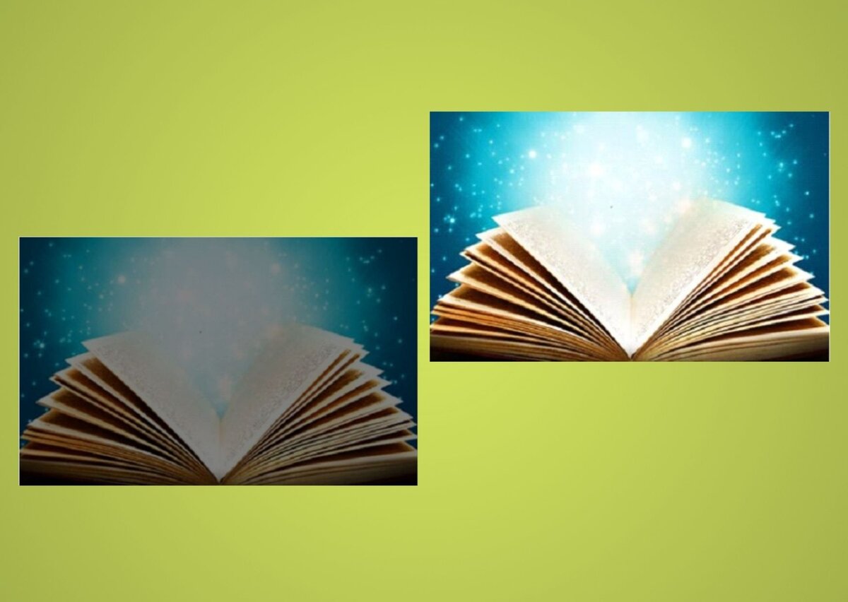 Справа - ярко светящаяся серебристым светом, книга, слева - более тусклая.
