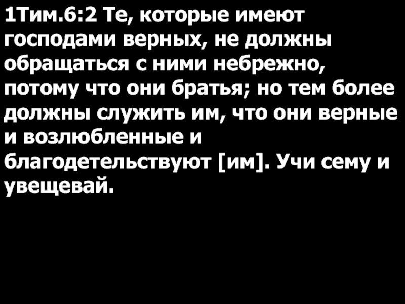 «Рабы, под игом находящиеся, должны почитать господ своих достойными всякой чести, дабы не было хулы на имя Божие и учение. Те, которые имеют господами верных, не должны обращаться с ними небрежно, потому что они братья; но тем более должны служить им, что они верные и возлюбленные и благодетельствуют [им]. Учи сему и увещевай» (1 Тим. 6:1, 2). Христианство может проникнуть в любую культуру и сплотить самых разных людей в хорошо работающее и даже счастливое сообщество (Гал. 3:26-28). Одной из самых серьезных для него проверок на прочность в первом веке был преобладавший в большинстве стран рабовладельческий строй. Но даже в этой области Павел показывает, какое поведение христиан достойно похвалы. Рабы "должны почитать господ своих достойными всякой чести" (6:1). Опять перед нами слово "честь" (5:3, 17). В данном контексте говорится об оказании чести тому, "кто выше других по положению". Еф. 6:5-8 показывает, как можно выказывать такое почтение и что оно предполагает. Это как раз тот сл