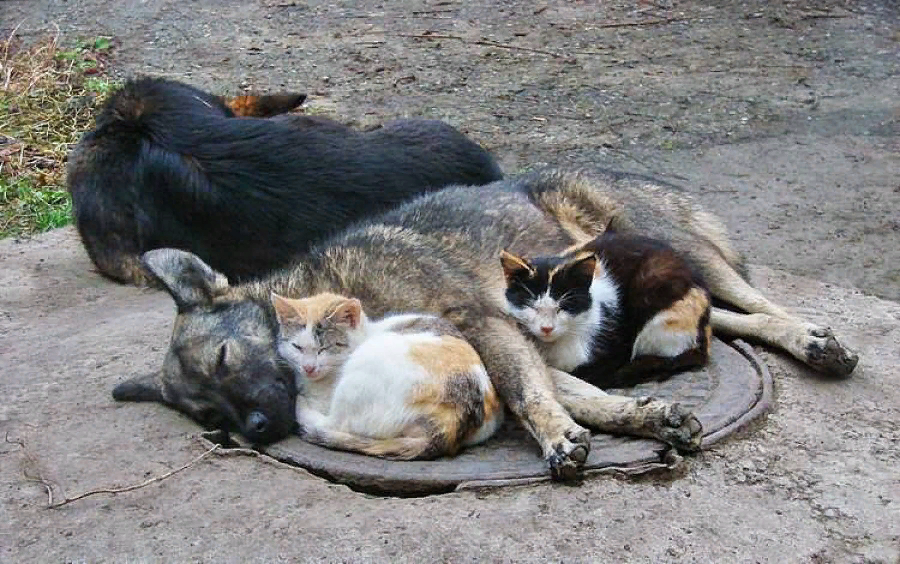 спим.Две овчарки и две кошки отдыхали на железной