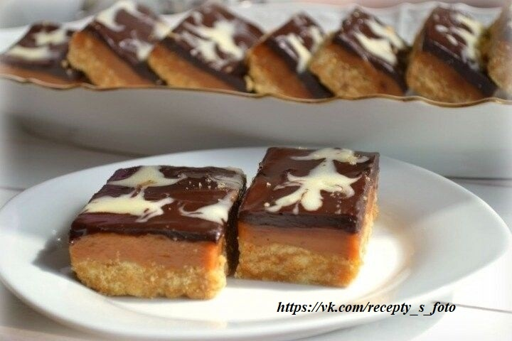 7. Форму поставить в морозильную камеру на 20-30 минут, чтобы затвердел шоколад. Порезать на полоски.Песочно-карамельные полоскиИнгредиенты:Печенье песочное — 300 г