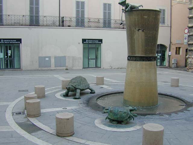 В Фолиньо две его работы – «Геркулес», или Геракл, который символически поддерживает Время и Историю, - скульптура, посвященная Джузеппе Пьермарини. Архитектор, который создал такие шедевры, как Театр Ла Скала в Милане и Королевская вилла в Монце, а в 1779 году получил должность королевского архитектора.торая работа – фонтан, посвященный «Памяти павшим», расположен на площади Дон Минцони, где раньше был Дворец Родати, XVII века, разрушенный в 1944 году. В центре композиции - песочные часы (пока не прочитала об этом, думала, что это простая колонна). По периметру - бронзовый фриз, на котором изображены известные персоны и важные эпизоды из жизни Фолиньо: Коломба Антониетти, которая сражалась вместе с своим мужем против Бурбонов, партизан Франко Цири, убитый нацистами, бомбардировка 22 ноября 1943 года и землетрясение 1997 года.