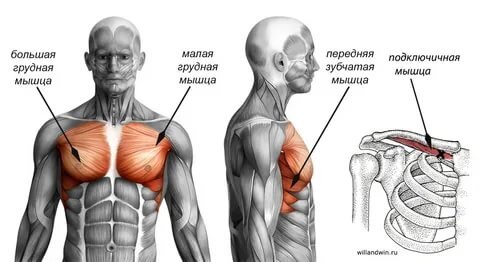 Грудные мышцы покрывают верхнюю часть плечевой кости и грудину. Именно благодаря грудным мышцам человек может приводить руки к средней линии тела и вращать ими внутрь. «Отталкивающие» движения человек также совершает при активном участии мышц груди, хотя при этом участвуют и дельтовидные мышцы плеча, и трехглавые мышцы рук. Большая грудная мышца имеет веерообразную форму и состоит из 3 частей, или пучков. Ключичная (верхняя) часть крепится к ключице, грудино-реберная (средняя) – к грудине, а брюшная (нижняя) начинается от прямой мышцы живота. При сокращении большой грудной мышцы происходит движение в плечевом суставе. Она приводит руку и вращает ее внутрь. С боковой части груди расположена передняя зубчатая мышца. Она начинается от лопатки и крепится спереди к восьми верхним ребрам. Передняя зубчатая мышца притягивает лопатку вперед, обеспечивая ей стабильное положение относительно грудной клетки. Она задействована в большинстве упражнений на мышцы груди и испытывает особую нагрузку при жиме лежа. Малая грудная мышца находится под большой грудной мышцей. Она выполняет лишь незначительные движения и не оказывает влияния на размер груди.