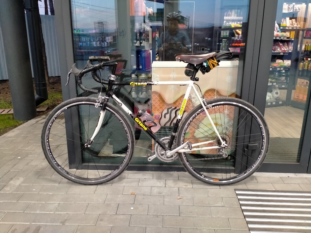 Кроме толстых покрышек, я поставил седло «Брукс» со своего дорожника. Взял запасную складную покру и прикрепил под седло так, что из нее получился Ass Saver. Две запасные камеры зафиксировал к подседелу. Небольшая сумочка с инструментом под седлом. Одна велобутылка на 650. Поясная сумка с мелочами. Утро было прохладным, и в течение дня обещали дождь. Надел куртку, наколенники и поддеву под джерси.