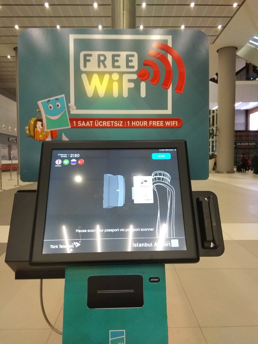 У нас была длительная пересадка в новом аэропорту Стамбула и без Wi-Fi, ну не как. Оказалось, что подключить интернет можно по номеру телефона только на один час, в отличии от других аэропортов, где я бывала. Там не было ограничений на пользование интернетом. Так вот, когда интернет через час закончился, еще на один час можно подключить только по паспорту. Процедуру подключения