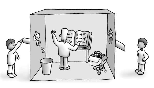 Вернемся к Сирлу, который находил сильный ИИ раздражающим и хотел опровергнуть его. Он просит нас представить человека, который не понимает китайского, сидящим в комнате. В комнате есть руководство, в котором рассказывается, как отвечать на строку китайских иероглифов другой строкой символов. Кто-то за пределами комнаты подсовывает под дверь лист бумаги с китайскими иероглифами. Мужчина находит правильный ответ в руководстве, копирует его на лист бумаги и сует обратно под дверь.