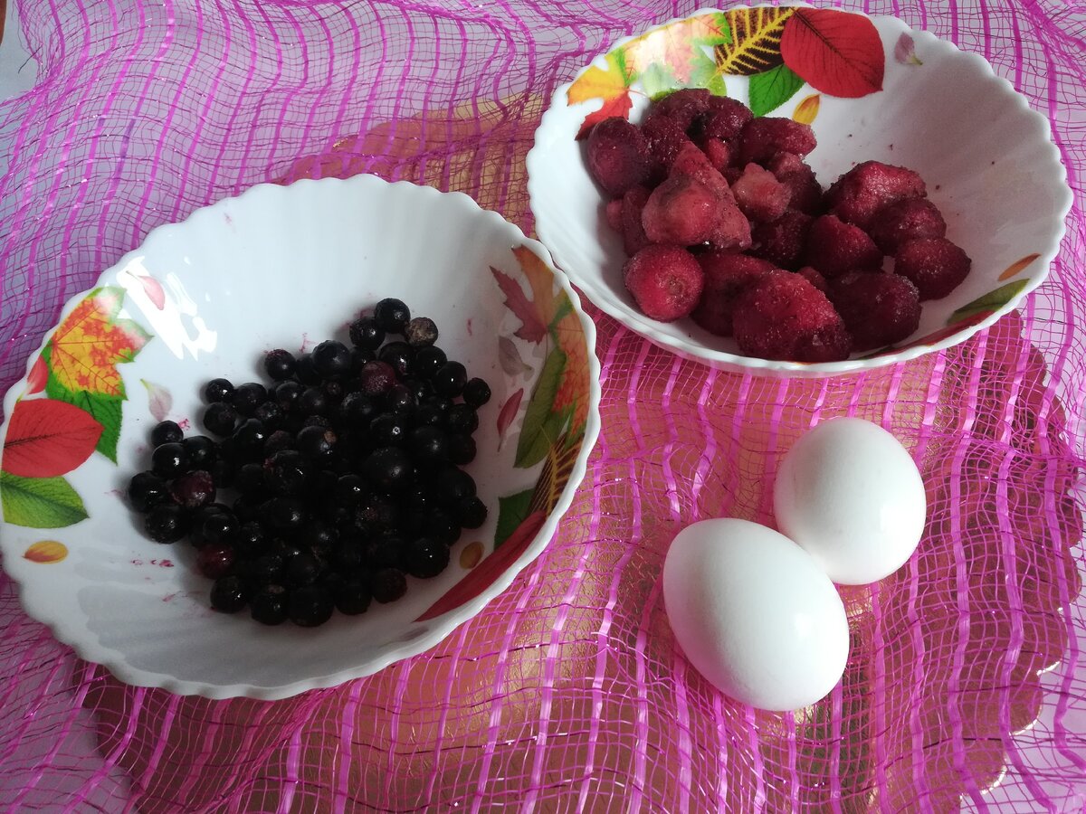 Ягоды размораживаю в микроволновке. Крупные ягоды можно порезать на более мелкие кусочки. Добавляю к тесту и еще раз все хорошо перемешаю.