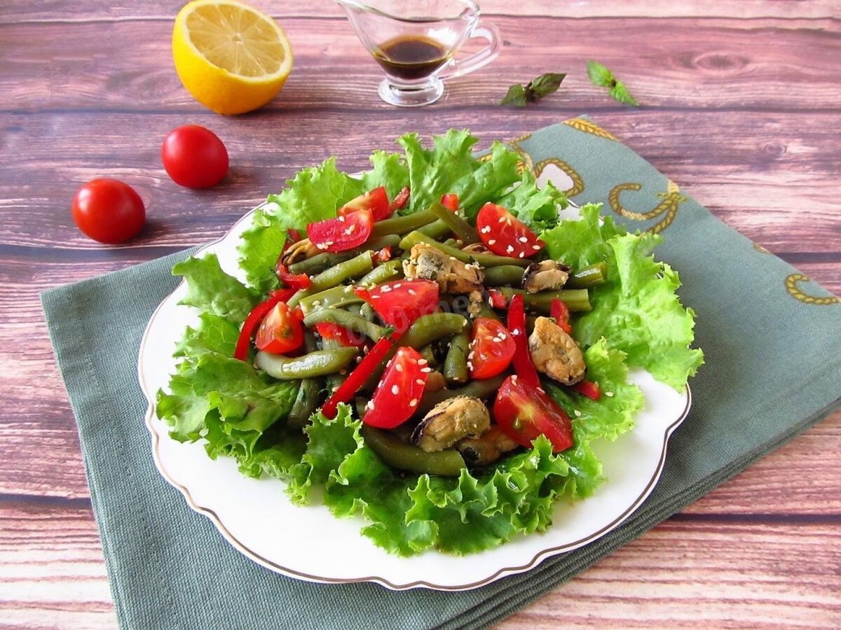 Яркий и полезный салат из овощей с мидиями. Этот овощной салат легкий, но и питательный благодаря мидиям и стручковой фасоли. Мидии отлично сочетаются с овощами и салатной заправкой. Для салата можно взять и другие морепродукты: кальмары или креветки.