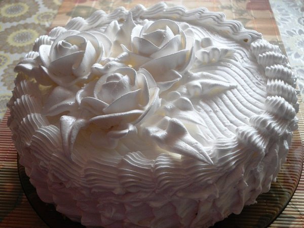 - Положить коржи друг на друга, прослоив их клюквенным или кизиловым желе, при этом верхний корж следует положить нижней поверхностью вверх, чтобы поверхность торта была ровнее, и нанести на нее ровный слой крема. Бока торта также смазать кремом и украсить отдельно испеченными мелкими меренгами. Отдельно из крема приготовить мелкие цветочки, отсадить их на лист кальки, хорошо охладить и перенести на поверхность торта. Поместить торт в холодильник не менее чем на 2 часа.