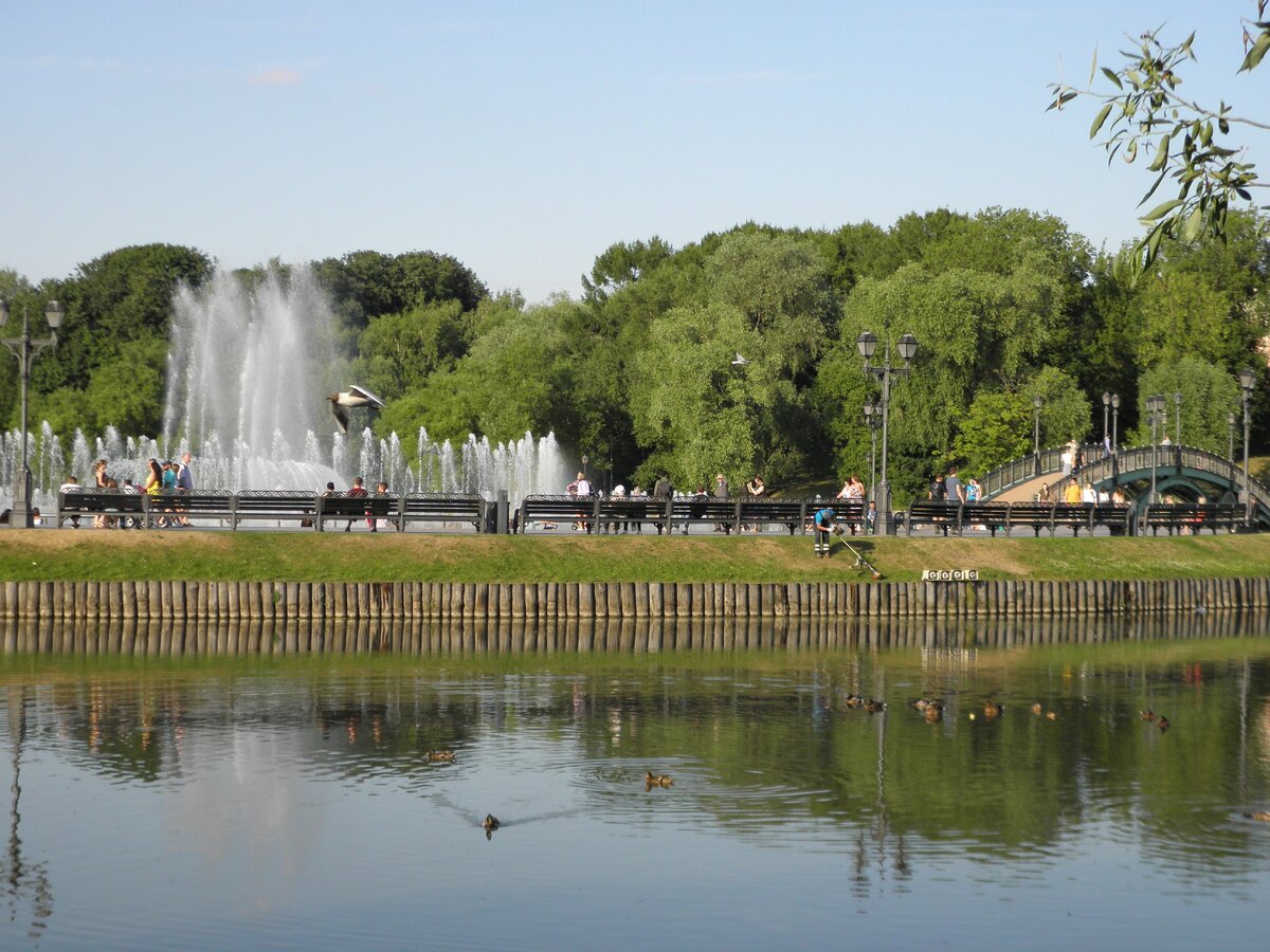 Выйдя из метро Царицыно, попадаем сразу к фонтану. Здесь всегда много людей, ведь фонтан очень красиво танцует — малышей просто завораживает это зрелище! А сколько веселых взвизгов, когда до них долетают брызги! Фонтан находится на середине пруда, и соединен с берегом двумя мостами. Если идти по дорожкам вдоль берега, можно увидеть уточек и покормить их. Здесь тоже есть лавочки и урны, но их меньше, и они почти все на солнце. Зато людей здесь мало.