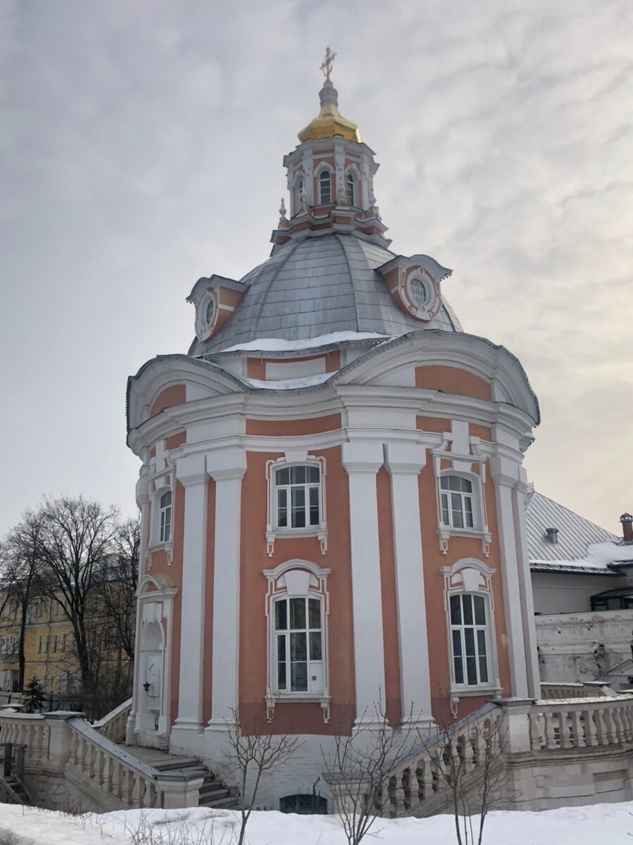Смоленская церковь – единственный в монастыре храм, имеющий в плане форму круга «с четырьмя глубокими криволинейными нишами на всю высоту стен». Волнообразный ритм стены подчеркнут изогнутыми фронтонами, плоскими сдвоенными пилястрами и усложнен двойной полосой окон в скульптурных наличниках, завершенный гармоничной формы куполом и световым фонарем с миниатюрной фигурной главой и крестом - прекрасный образец архитектуры елизаветинского барокко, но с удивительным художественным тактом вписанный в древний ансамбль монастыря.