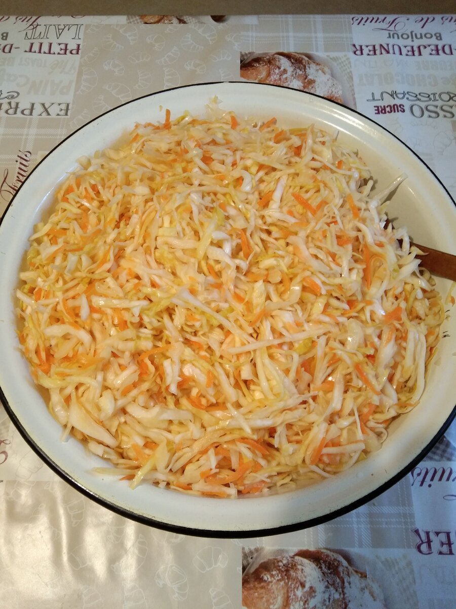 Вчера слила рассол с капусты, а саму капусту из двух трехлитровых банок выложила в глубокий таз. Оставила капусту на сутки, накрыв полотенцем и периодически перемешивая.
