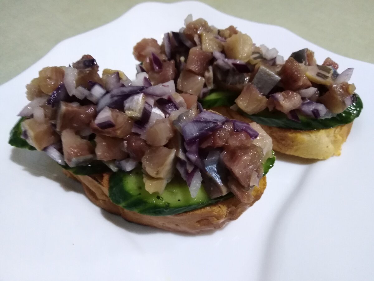 Выложил на тосты огурцы и сельдь с луком, немного полил оставшимся маринадом. Получилось очень вкусно!