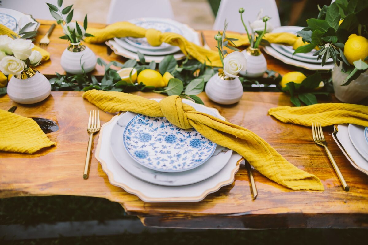 Декораторы решили использовать не только желтый текстиль, но и вазы с букетами из зелени и лимонов! Вечеринка проходила на заднем дворе, поэтому в декоре было много природных элементов, например, винтажный деревянный стол.