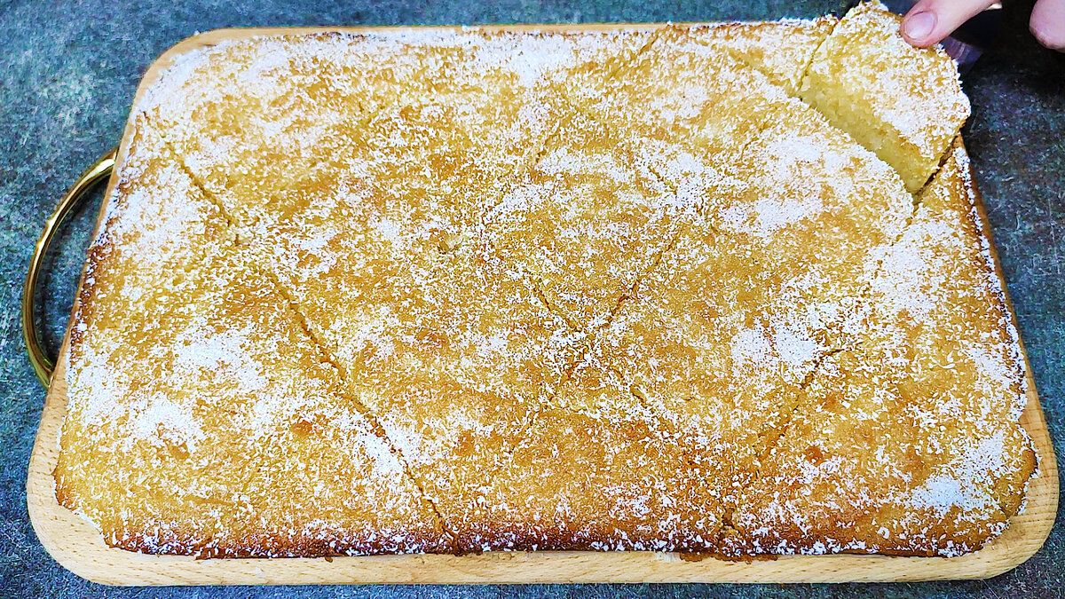 Испекшийся пирог не доставая из формы, разрезаем на кусочки и пропитываем подготовленным сиропом, сверху посыпаем кокосовой стружкой и подаем к столу. Пирог получился нежный и мягкий. Приятного аппетита!