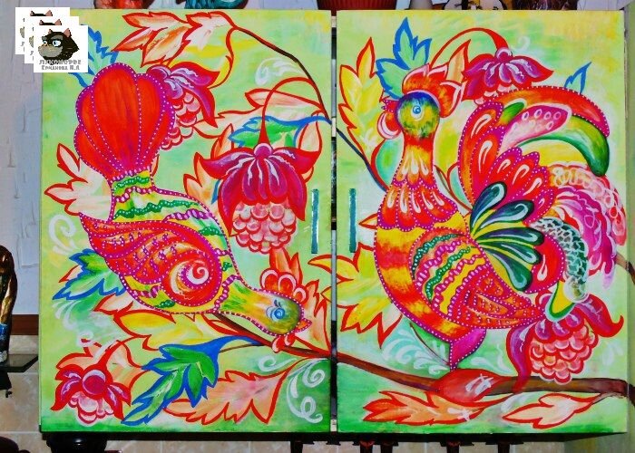 Силуэты наших героев заполняем белой водоэмульсионной краской, тоненьким слоем. Это поможет с лёгкостью перекрыть цвета фона, и нарисовать петушка с курочкой в один слой краски. Перед дальнейшей росписью водоэмульсионная краска должна высохнуть(это быстро).