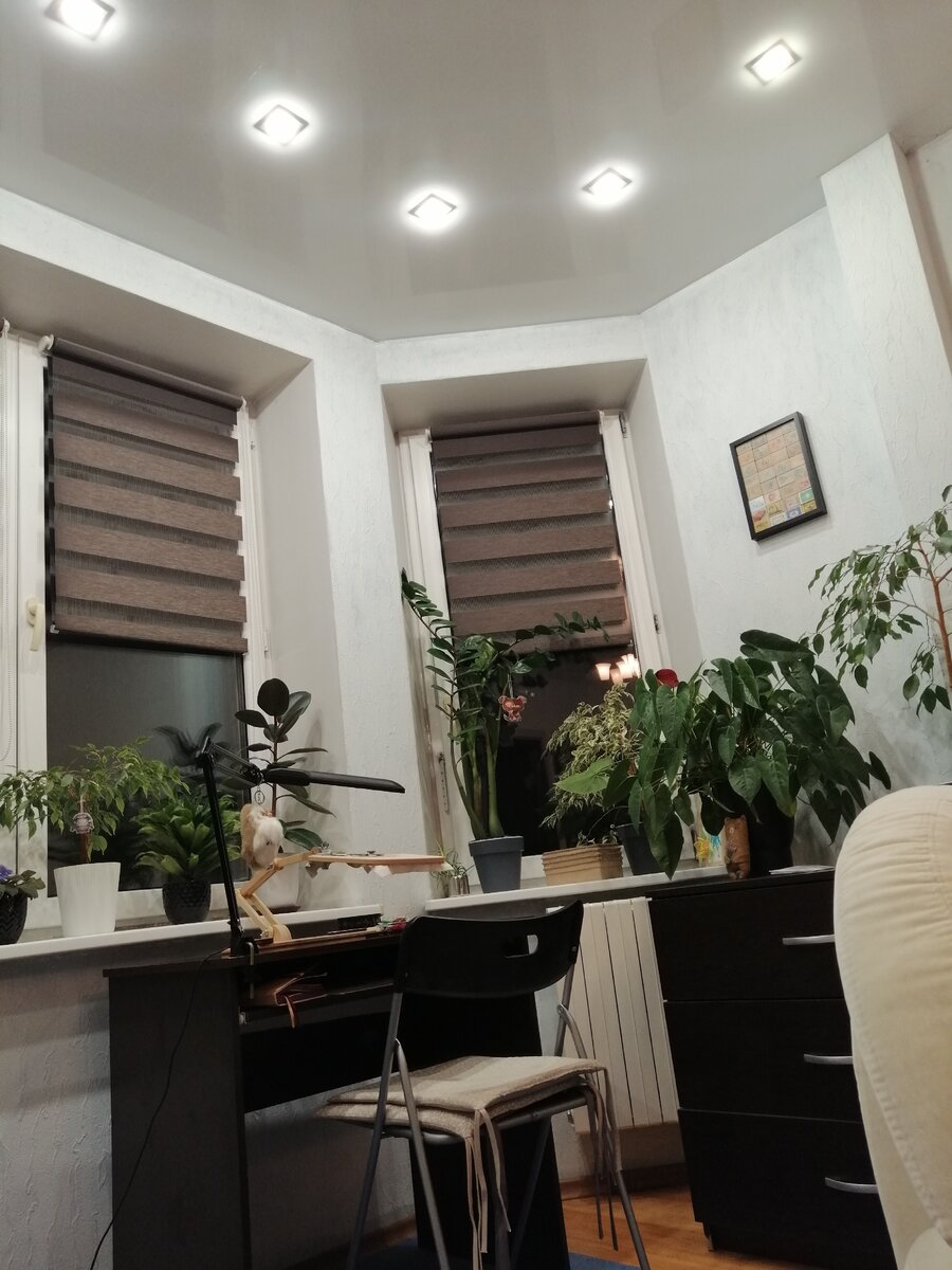 Во-первых, есть основное освещение в комнате - потолочные светильники непосредственно над столом. Им я пользуюсь в вечернее время.