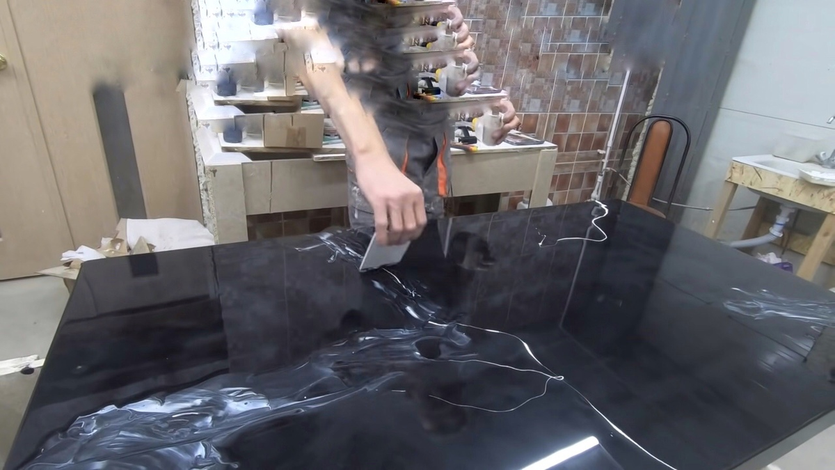 Для начала мы наносим на поверхность праймер, очень важно качественно закрасить каждый миллиметр. Поверхность подготовлена и праймер нанесён в два слоя. Далле обклеили борта скотчем, это нужно нам для того, чтобы смола аккуратно стекала на все 4 стороны вашего изделия. Далее добавляем отвердитель в смолу. Далее добавляем пигмент, у нас это перламутровый. Тщательно перемешиваем смолу. И приступаем к нанесению состава на поверхность. Для равномерного нанесения используем валик. Далее после заполнения смолой всей рабочей поверхности, с помощью корректора мы опрыскиваем всю столешницу.