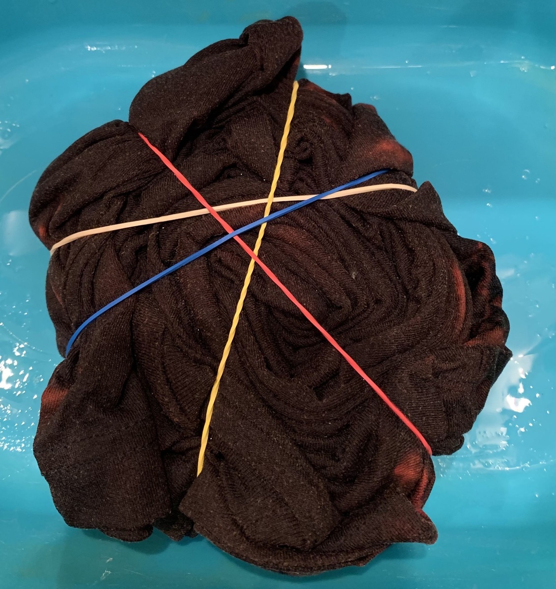 - Теперь смело берите в руку сосуд с полученной смесью и начинайте тонкой струйкой выливать её на скрученную футболку. Помните, что черный цвет не моментально изменится, а значит, не переусердствуйте с количеством отбеливающей жидкости, иначе есть вариант, что на выходе вы получите обыкновенную оранжевую футболку.