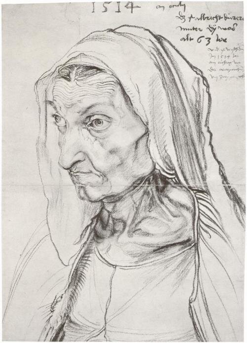 "Она сильно боялась смерти, но говорила, что но боится предстать перед богом. Она тяжело умерла, и я заметил, что она видела что-то страшное. Ибо она потребовала святой воды, хотя до этого долго не хотела говорить. Вслед за тем ее глаза закрылись. Я видел также, как смерть нанесла ей два сильных удара в сердце и как она закрыла рот и отошла в мучениях. Я молился за нее. Я испытывал такую боль, что не могу этого высказать..." * (*Дюрер А. Дневники..., т. 1, с. 88, 90.).