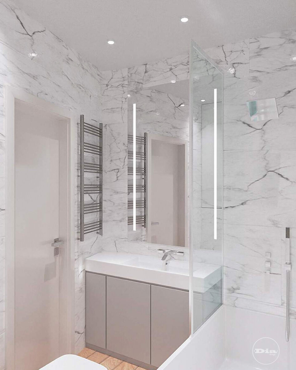 Ванная комната с идеальным сочетанием глянцевой поверхности мрамора и фактурного рисунка дерева