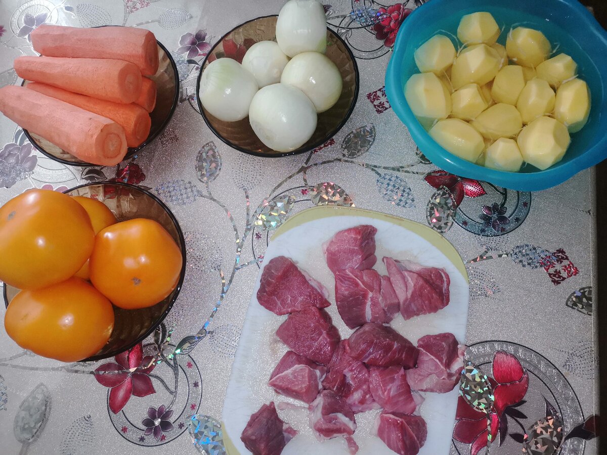 1 кг мяса 1 кг помидоров 1 кг лука 1 кг морковки 1.5-2 кг картофеля соль специи по вкусу готовить 45 мин готовить в казане, перед подачей на стол перевернуть блюдо в глубокий поднос, получиться слоями и присыпать сверху зеленью