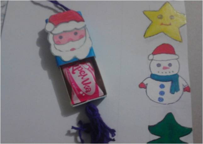 После когда все высохло и украшено вырезаем рисунки, берем нашу основу для подарка и приклеиваем фигурку. Чтобы подарки были еще красивее, украшаем его стразами. Если вы хотите сделать из коробков ёлочные игрушки с секретом, то нужно к ним прикрепить ниточку или ленту.